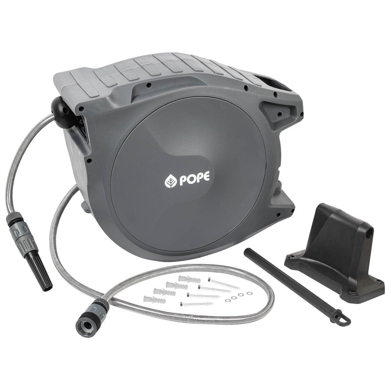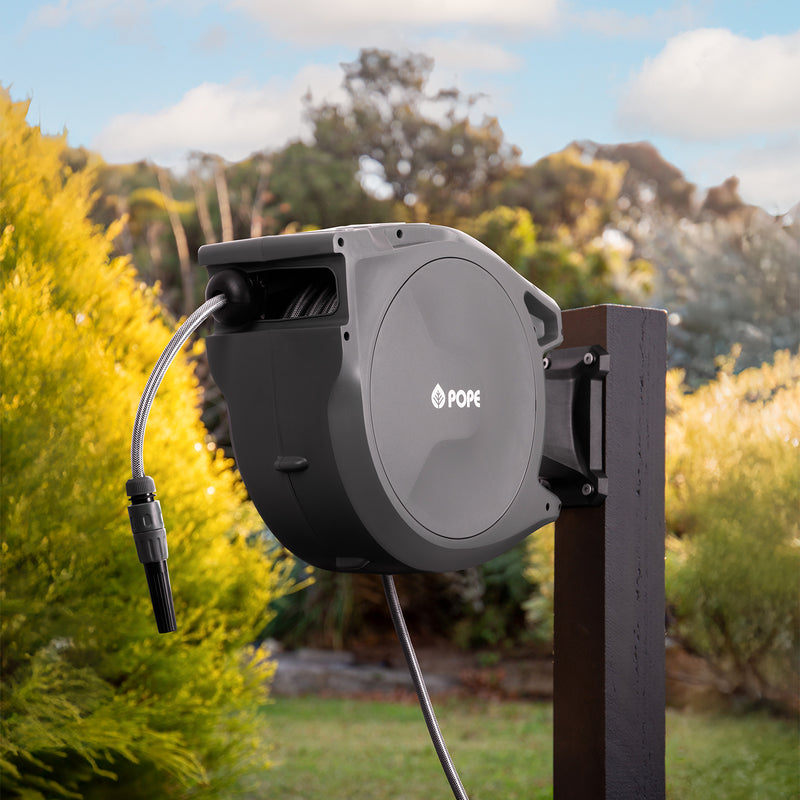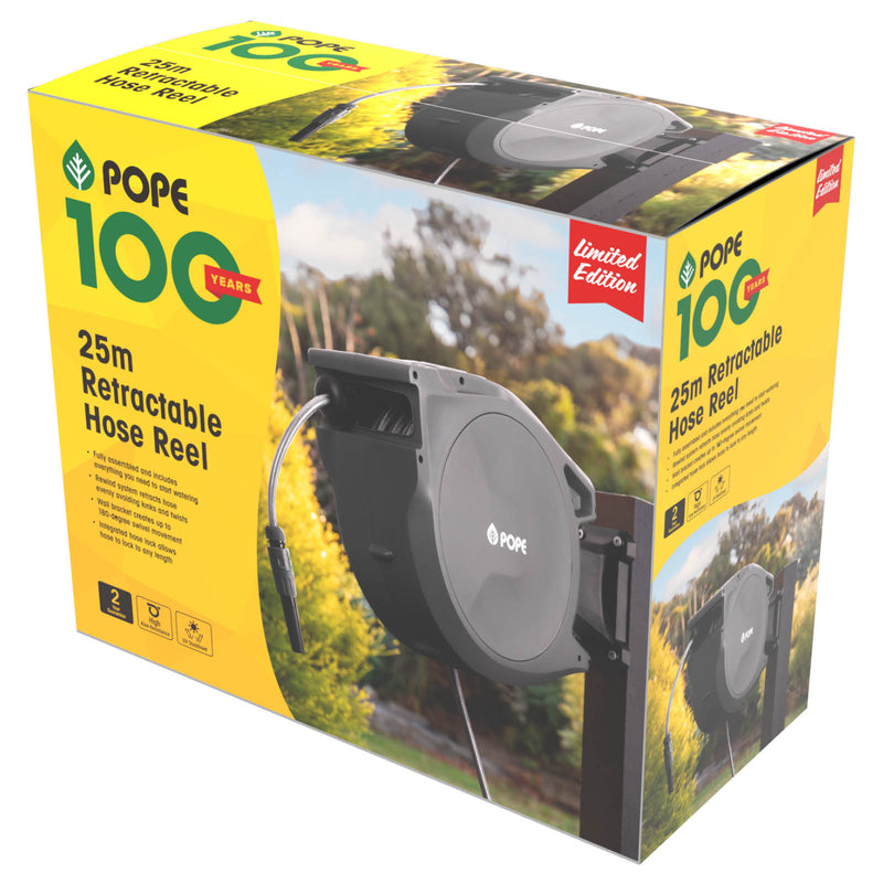 This Limited-Edition Pope 100 Year 25m Retractable Hose Reel is fully assembled and includes everything you need to start watering. The reel features a rewind system that retracts hose evenly avoiding kinks and twists. The wall bracket creates a 180 degree swivel movement and the integrated hose lock allows the hose to lock at any length.