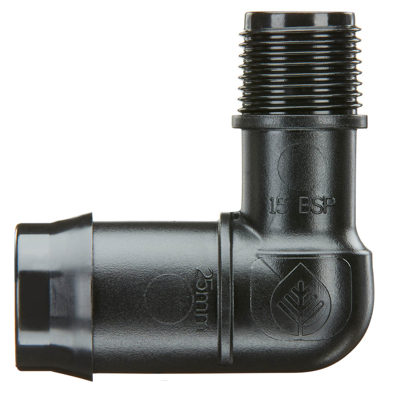 The Pope 25mm Barbed x 15mm BSPM Threaded Elbow is used to connect a 15mm BSP female fitting, such as a pop-up or shrub adaptor, to an end of 25mm poly pipe. Secure the elbow to the pipe with locking clamps.