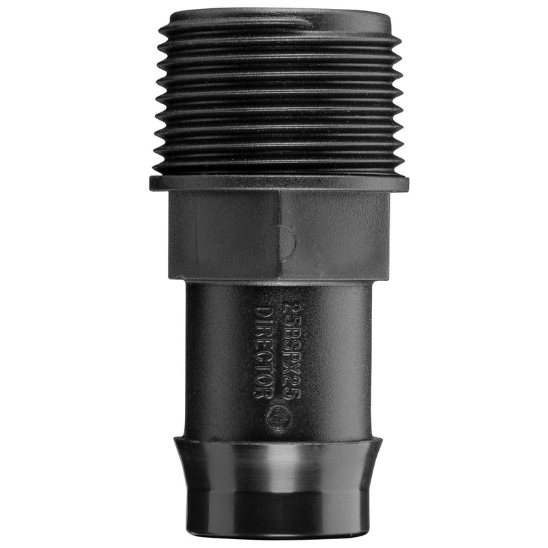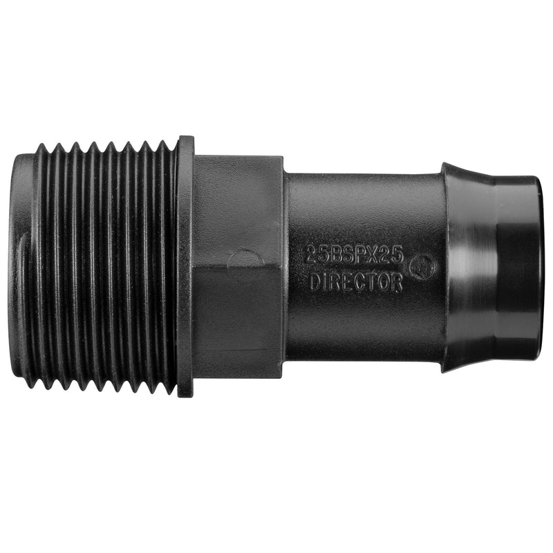 The Pope 25mm Barbed x 25mm BSPM Director is used to connect 25mm poly pipe to a solenoid valve. Secure the director to the pipe with either a locking clamp or Loc-Sure® clamp.