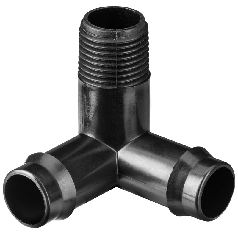 The Pope 19mm Barbed x 15mm BSPM Threaded Corner Elbow is used to connect a 15mm BSP female fitting, such as a pop up or shrub adaptor, to a corner of an irrigation line. Secure the elbow to the tube with either a locking clamp or Loc-Sure® clamp.