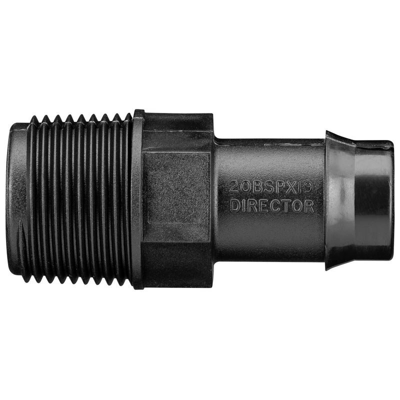 The Pope 19mm Barbed x 20mm BSPM Director is used to connect 19mm poly tube to a solenoid valve. Secure the director to the tube with either a locking clamp or Loc-Sure® clamp.