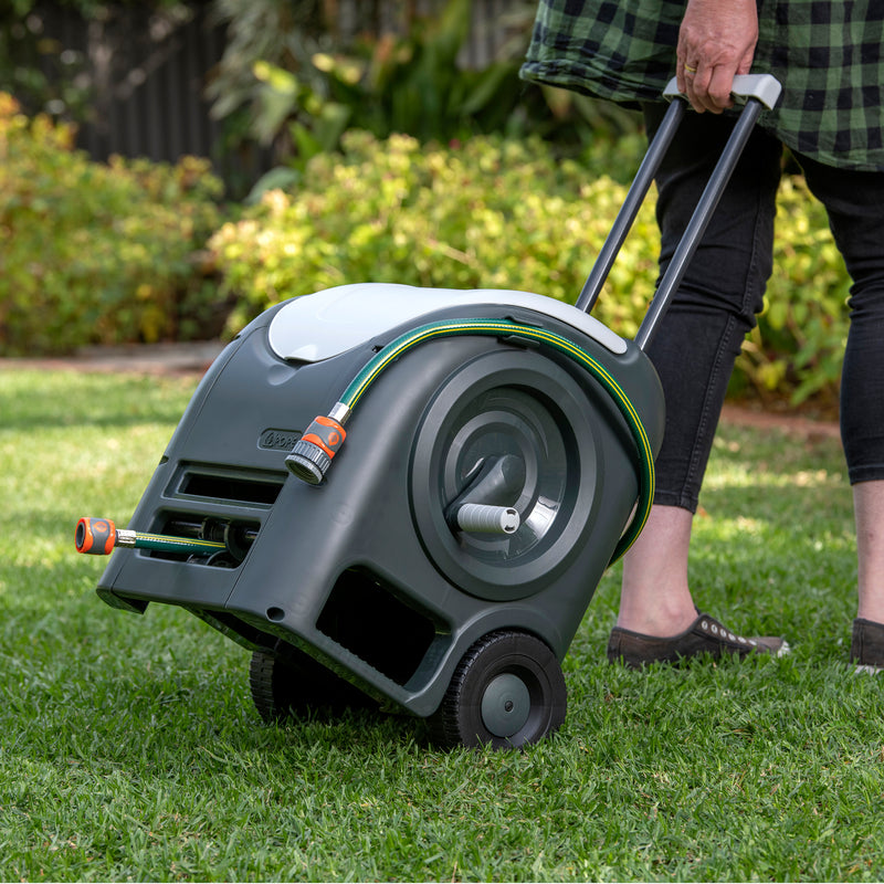 The cart offers a full cover and case to protect and prolong hose life. It will neatly store your garden hose onto the reel in layers. Built-in layering guide makes hose winding a hassle-free task while large wheels allow you to easily manoeuvre your cart around the garden.