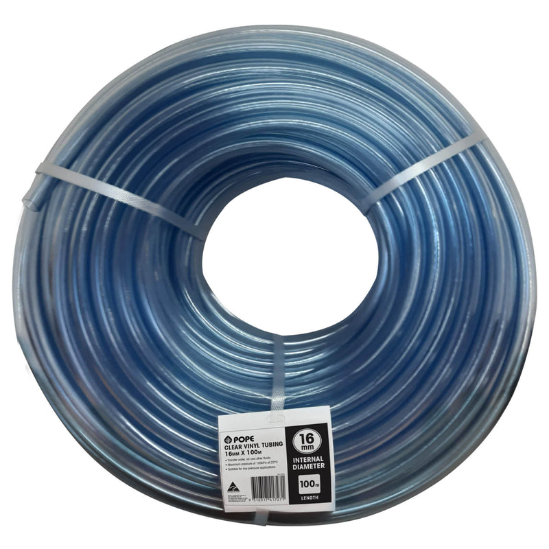 Pope Clear Vinyl Tubing is suitable for the transfer of air, water or other liquids at low pressure. This clear flexible tubing provides a visual reference for easy identification of blockages or foreign objects. It is suitable for use with petrol contact with siphon lines, cable protection and drainage lines.