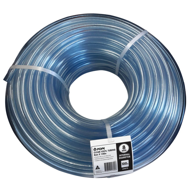 Pope Clear Vinyl Tubing is suitable for the transfer of air, water or other liquids at low pressure. This clear flexible tubing provides a visual reference for easy identification of blockages or foreign objects. It is suitable for use with petrol contact with siphon lines, cable protection and drainage lines.