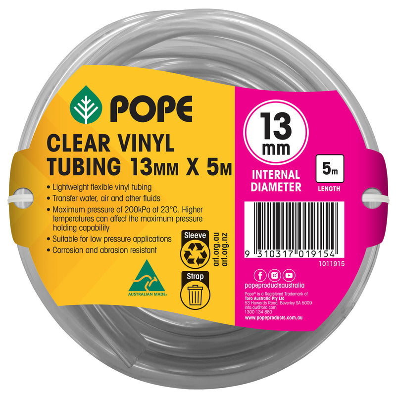 Pope Clear Vinyl Tubing is suitable for the transfer of air, water or other liquids at low pressure. This clear flexible tubing provides a visual reference for easy identification of blockages or foreign objects. It is suitable for use with petrol contact with siphon lines, cable protection and drainage lines.