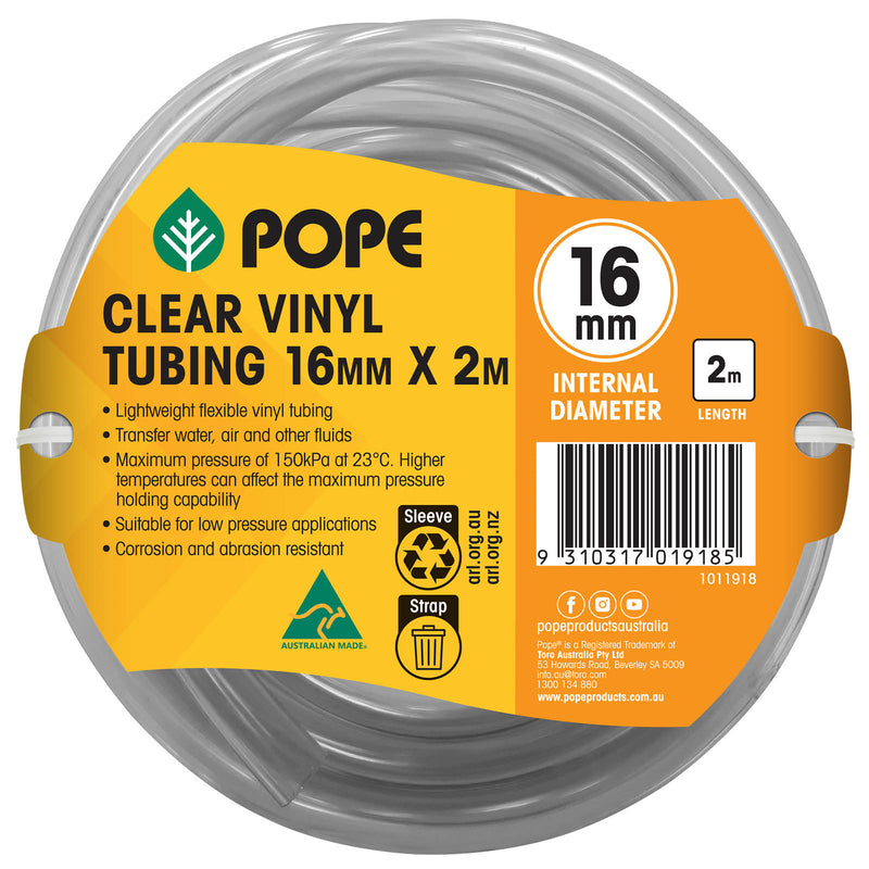 Pope Clear Vinyl Tubing is suitable for the transfer of air, water or other liquids at low pressure. This clear flexible tubing provides a visual reference for easy identification of blockages or foreign objects. It is suitable for use with petrol contact with siphon lines, cable protection and drainage lines.