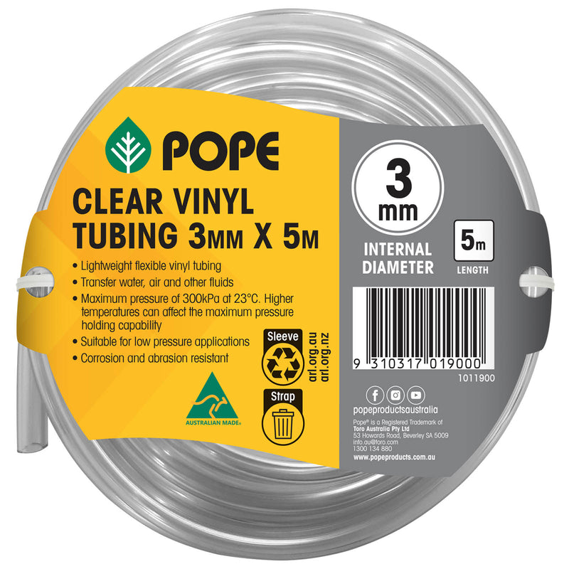 Pope Clear Vinyl Tubing is suitable for the transfer of air, water or other liquids at low pressure. This clear flexible tubing provides a visual reference for easy identification of blockages or foreign objects. It is suitable for use with petrol contact with siphon lines, cable protection and drainage lines.