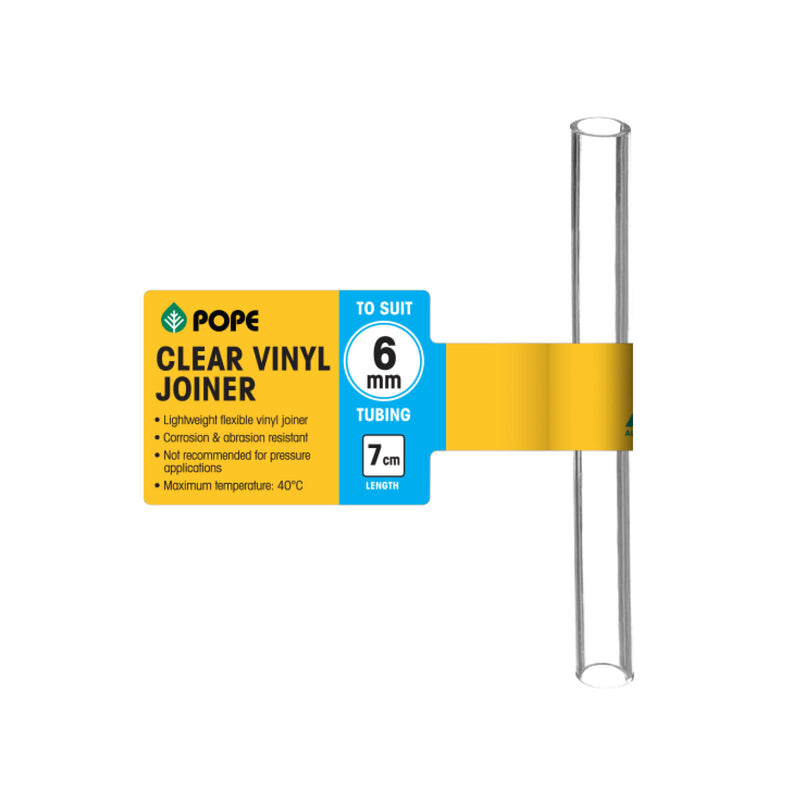 The 6mm Clear Vinyl Tubing Joiner is used to join 6mm tubing.