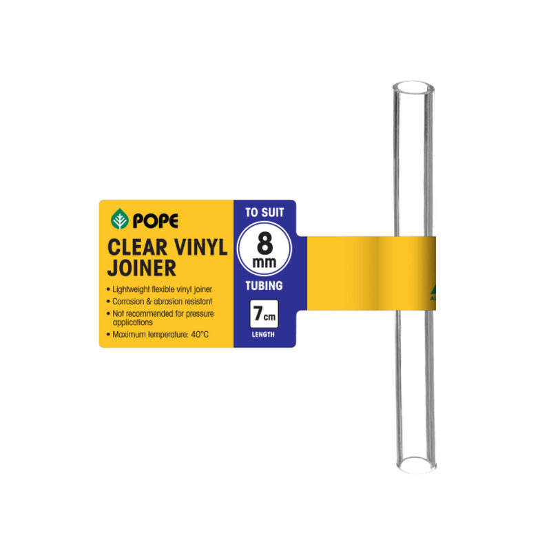 The 8mm Clear Vinyl Tubing Joiner is used to join 8mm tubing.