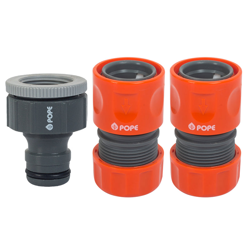 The Pope 18mm Hose Connector Set is what you need to connect your hose from a tap to a sprinkler or hand spray. It includes 2 x 18mm Hose Connector and 1 x 18mm Universal Tap Adaptor.