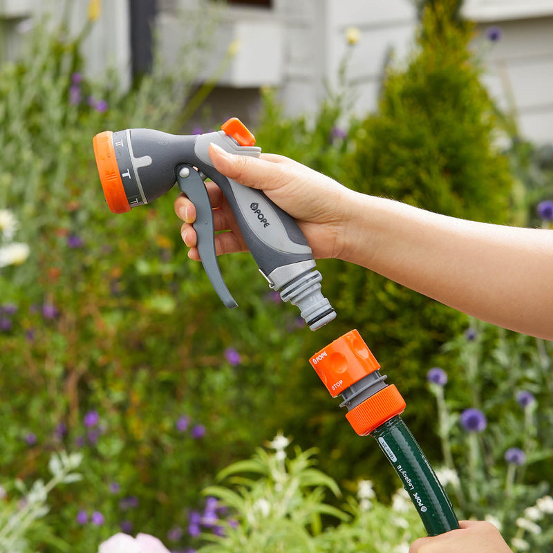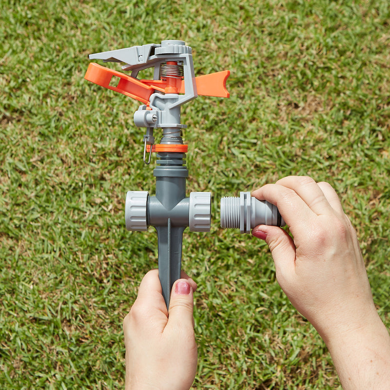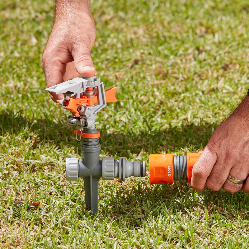 The Pope 18mm x 20mm BSP Sprinkler Adaptor is inserted into either a hand spray or sprinkler with a 20mm (3/4") BSP thread, so it can be attached to a 18mm garden hose.