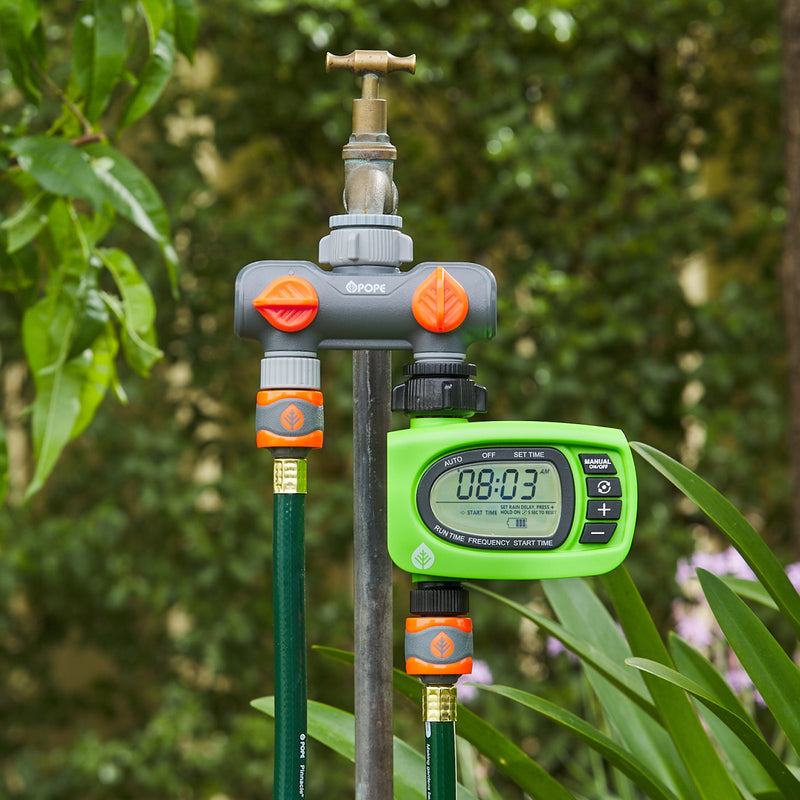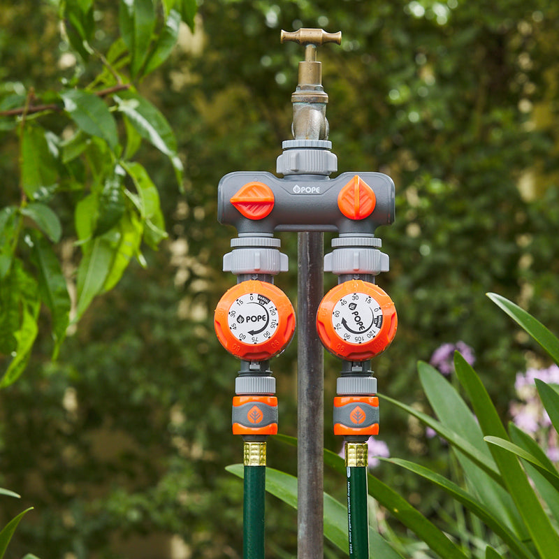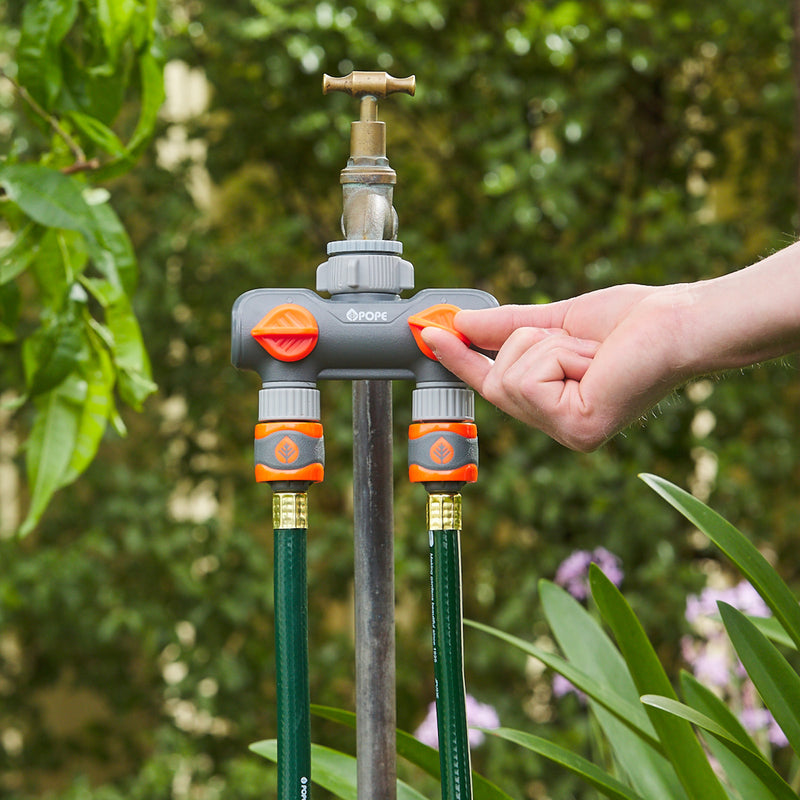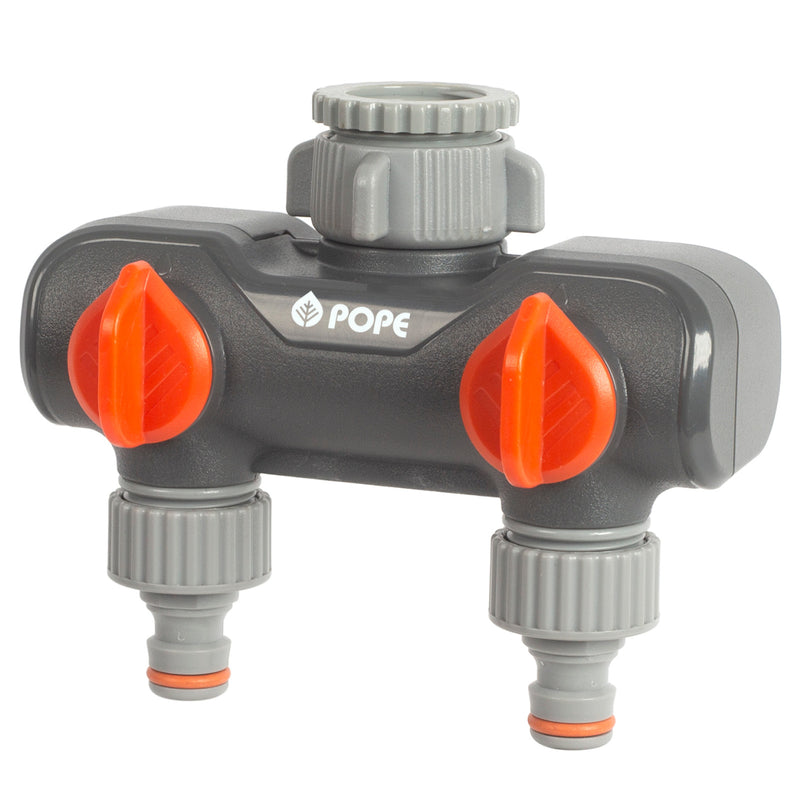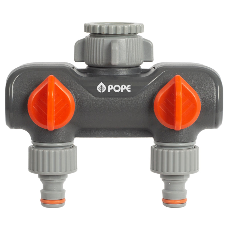 The Pope 2 Way Tap Outlet provides two independent and straight outlets ideal for connecting two tap timers next to each other. Large ergonomically designed knobs to easily turn water on and off.