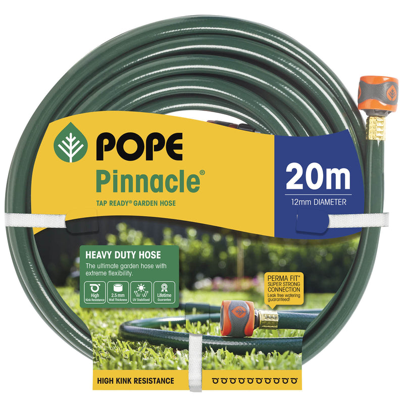The Pope Pinnacle® Garden Hose is a premium heavy duty reinforced braided garden hose that is supplied Tap Ready®. This light weight hose is extremely flexible making it great for moving around the garden easily with no kinks! Featuring 12mm comfort grip hose connectors with Pope’s exclusive Perma Fit® super strong connections to ensure secure and leak free watering.