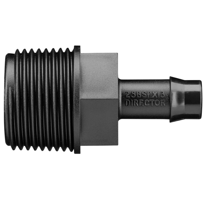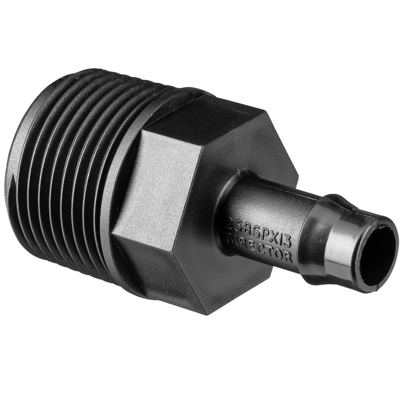The Pope 13mm Barbed x 25mm BSPM Director is used to connect 13mm poly tube to a solenoid valve. Secure the director to the tube with either a locking clamp or Loc-Sure® clamp.