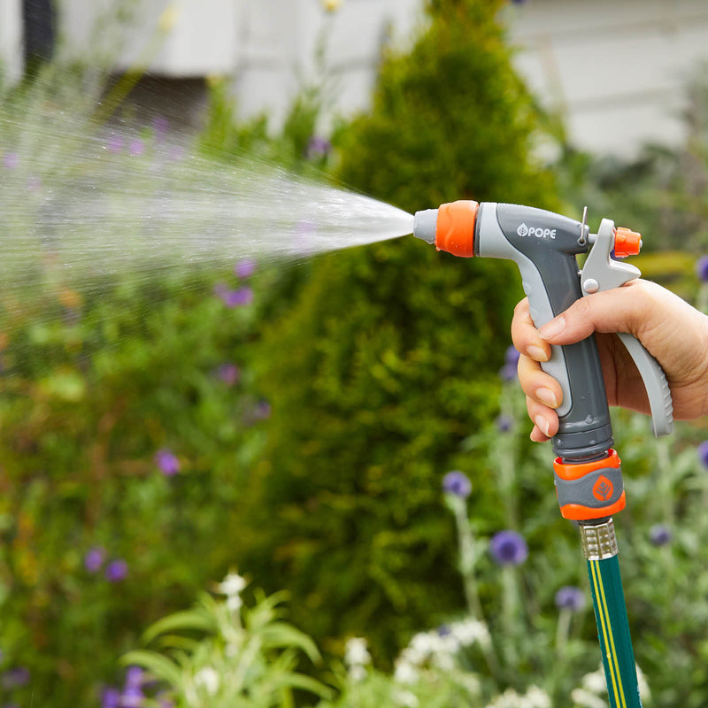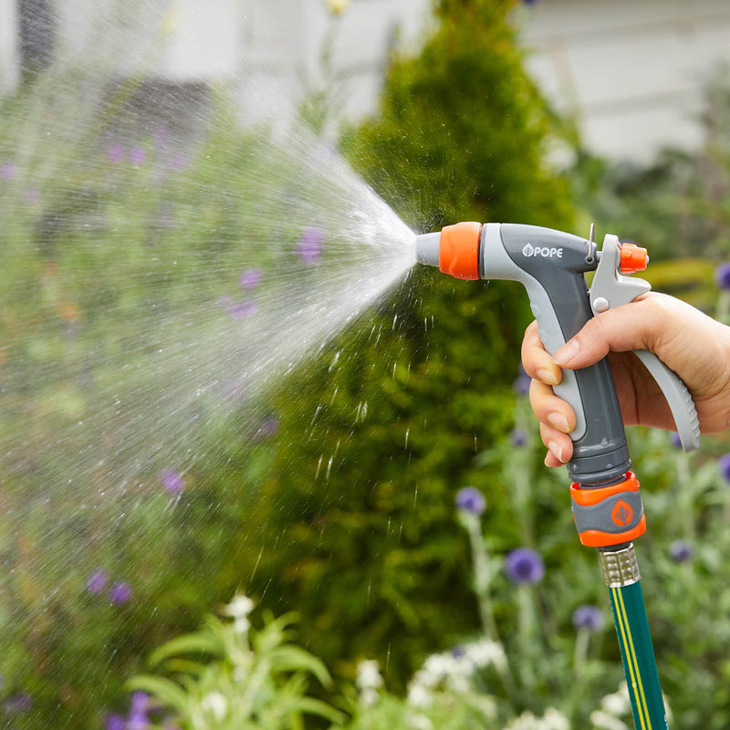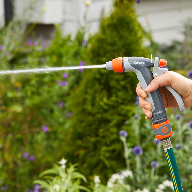 The Handy Spray Gun features a rear flow control trigger, soft rubber grip handle and an adjustable nozzle for a jet stream or mist spray. The knob above the trigger allows the user to set continuous flow without having to hold the trigger down, which reduces user fatigue.
